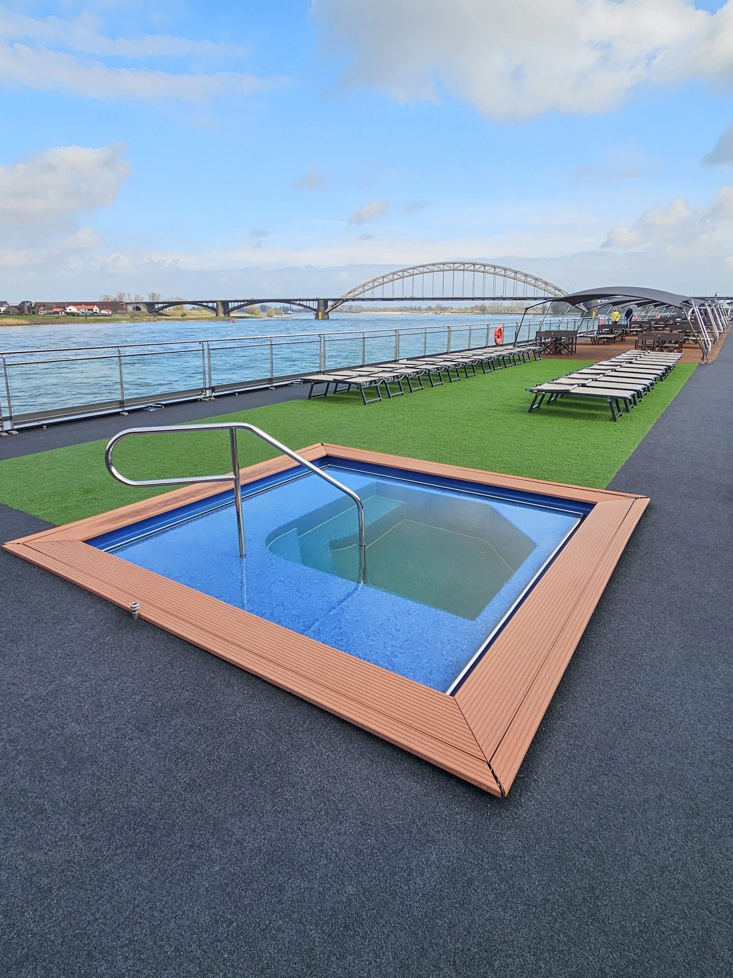 There are numerous seating and lounging options on the sun deck, which are set up when the weather is nice. The small, square pool is also located there in the stern area. The pool is heated but does not have a whirlpool function. It is also accessible in winter in good weather.